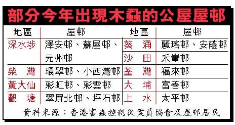 2011年香港蟲害控制從業員協會所提供資料顯示多個屋邨已被木蝨侵襲