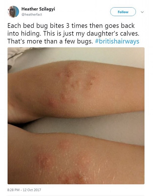 38歲的加拿大婦人 Heather Szilagyi 於2017年10月10日與未婚夫及7歲女兒乘搭英航客機,由溫哥華到斯洛伐克,中途在倫敦轉機。期間希瑟看到一隻蟲從前排座位背後的電視屏幕爬出來。從事酒店業的Heather因為工作關系,一眼便認出眼前的是床蝨。