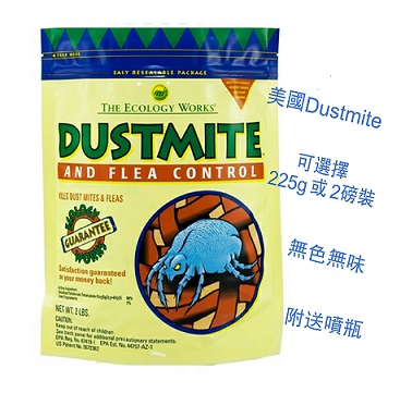 Dustmite 屬美國環保局及香港認可之滅蟲產品。原裝美國進口 Dustmite 易溶於水,適用於一般傢俬及布藝品;如床單、被鋪、枕袋、窗簾、梳化、服飾等等;含天然硼酸盬,直接攻擊各類害蟲的吸水器官,令害蟲慢慢乾渴而死,並把藥力帶返巢穴傳播至其他害蟲,使其脫水乾渴致死(而蟲蟲群也會自吃屍體死亡,形成連鎖效應)。有效消滅床蝨、木蝨、跳蝨、螞蟻等!