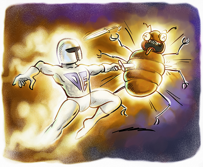 Diatomaceous Earth (often referred to as "DE") is an off white talc-like powder that is the fossilized remains of marine phytoplankton. When sprinkled on a bug that has an exoskeleton (such as bed bugs, ants or fleas) it compromises their waxy coating so that their innards turn into teeny tiny bug jerky. But it doesn't hurt mammals. We can eat it. We do eat it! It's in lots of grain based foods because lots of grains are stored with diatomaceous earth to keep the bugs from eating the grain!